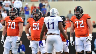 All three of the Cowboys were wearing the black helmets with the script Cowboys logo that they wore in the PlayStation Fiesta Bowl win over Notre Dame. I also like that they did not trade logos and put them on their helmets. They repped the Pokes well.