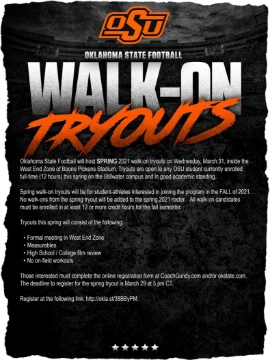 The tryouts on March 31 are open to any OSU student that is currently enrolled full-time (12 hours) on the Stillwater campus and is in good academic standing. The tryouts are for student-athletes interested in joining the team for the fall of 2021. No walk-ons will be added to the spring football roster as those athletes have been through the offseason program and are in top shape and ready for practices this spring.