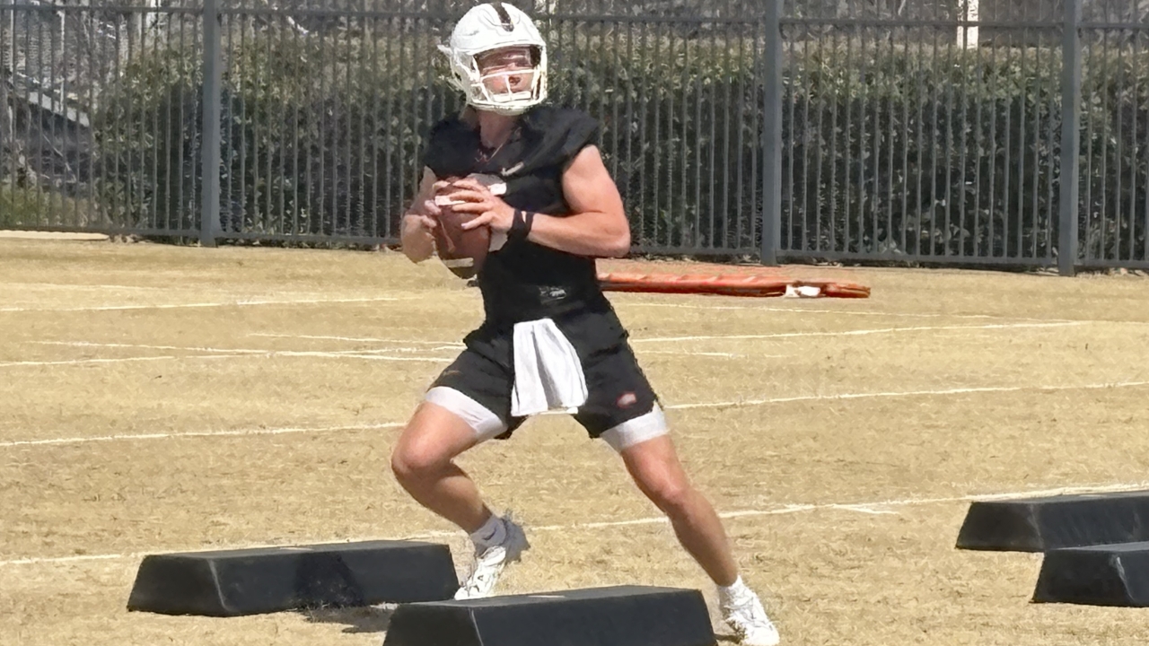 In Thursday’s second day of spring football during team Flores threw at least two touchdown passes, one to new running back Kaleb Hicks, a transfer from Oklahoma that catches the ball well out of the backfield. He also connected on a scoring toss with Shamar Rigby. He did well as at the end of practice head coach Mike Gundy had him call up the team.