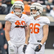 STILLWATER – Perhaps while you are reading this thousands of Oklahoma State fans, visitors, and probably a few Oklahoma State Cowboys football players are crammed onto Elm Street in Stillwater for the block party to celebrate the 50th anniversary of world-famous Eskimo Joes. That is a pretty cool thing as is the start of fall camp for the Cowboys. All of us are ready to wash out the taste of last season’s 3-9 finish. Head coach Mike Gundy has an all new on-the-field coaching staff and 65 players that were not part of the program a year ago. Most of those players came out of the transfer portal and that includes three transfer portal tight ends. Our feature position tonight also has a pair of freshmen to join veterans Josh Ford and Quinton Stewart.