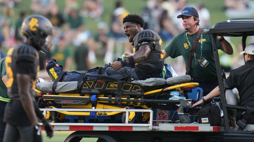Travian Barnes yells at his teammates and the crowd as he is carted out of McLane Stadium.