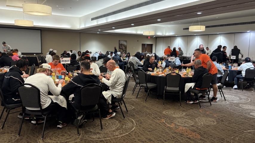 LAWRENCE, Kansas – Oklahoma State football arrived late Friday afternoon in Lawrence, Kan. at the Double Tree by Hilton where they will headquarter overnight preparing for a 3 p.m. kickoff on Saturday at David Booth Kansas Memorial Stadium for the 113th Homecoming Game in University of Kansas history.