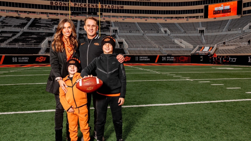 STILLWATER – As expected Oklahoma State’s new head football coach Eric Morris arrived in Stillwater on Snday (Dec. 7) with his wife Maggie and his son’s Jack and George. They flew in on a private jet and pretty quickly upon arrival were ushered inside Boone Pickens Stadium for a greeting complete with fight song and poms.